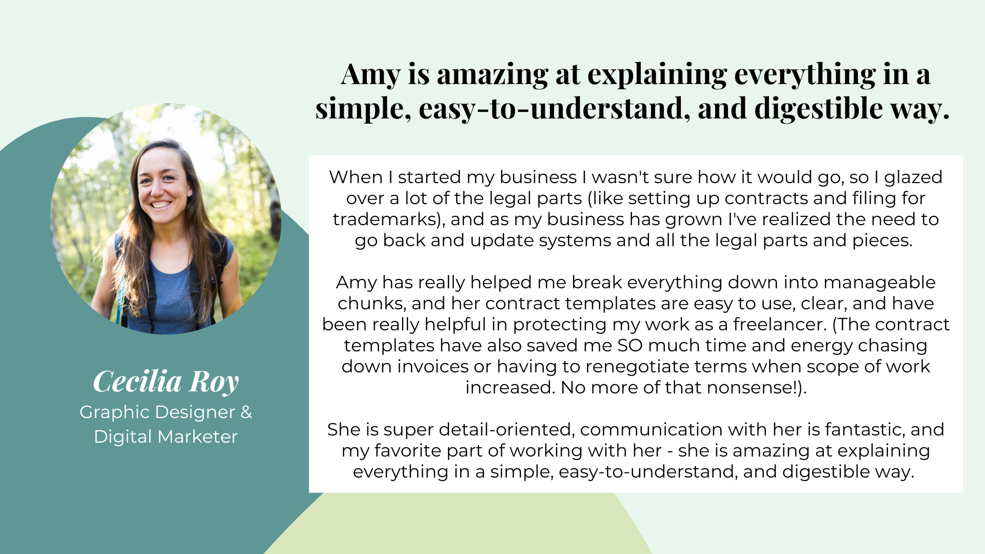 30+ plug-and-play legal templates so you never have to write a client contract or legal policy again. Here are a few of our students' favorites: